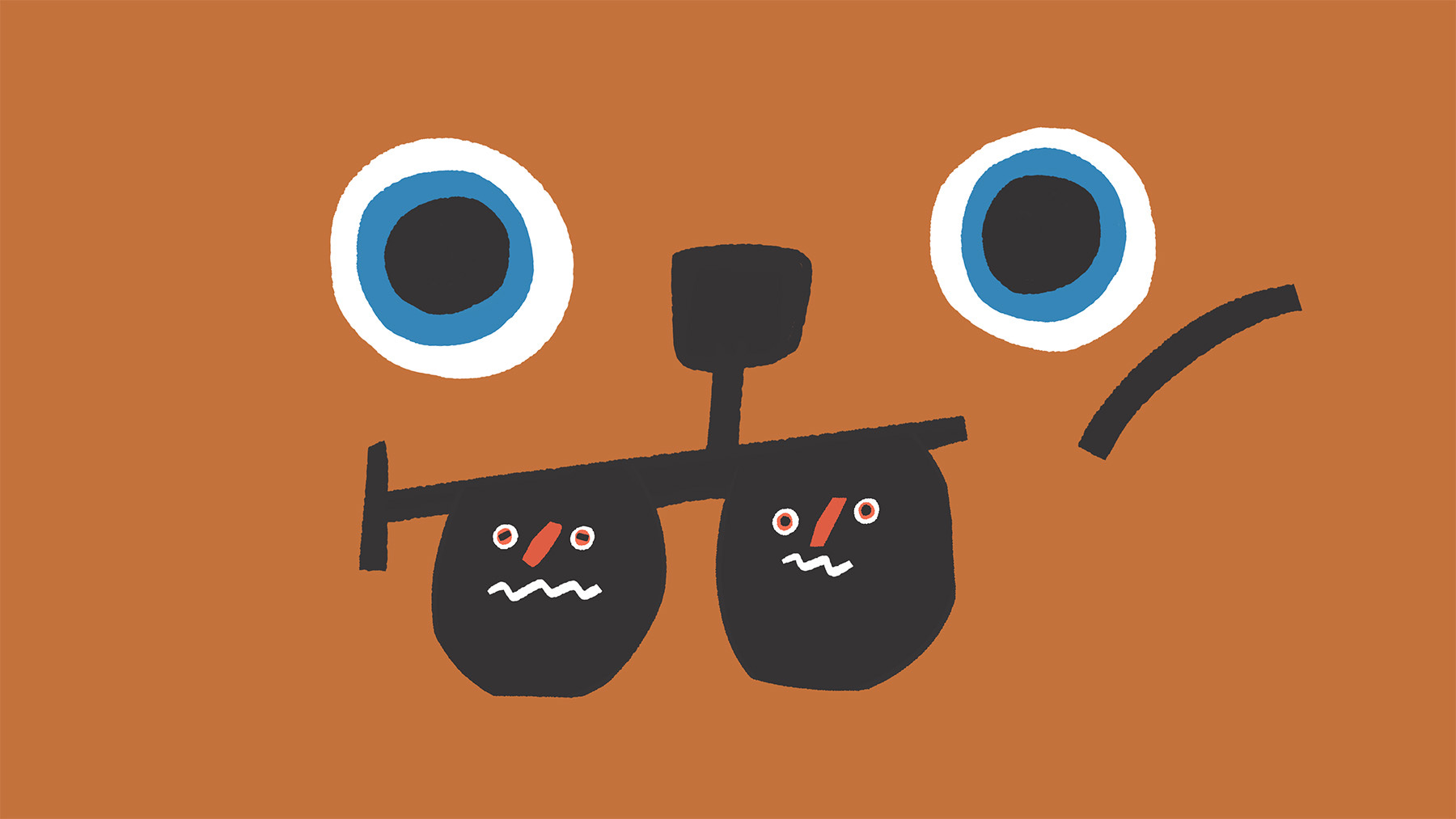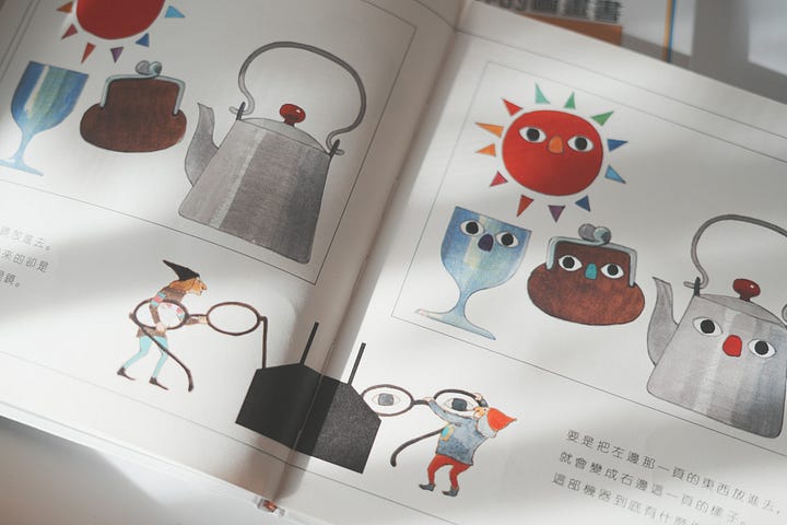 太陽公公、高腳杯、金口包、茶壺⋯⋯這些看似毫不相干的東西統統放進去,哇!就變出了同款眼睛和鼻子。這是詮釋「關係」這個抽象概念的開始——放入機器後,形成了不同原因、象徵符號與結果的等式。