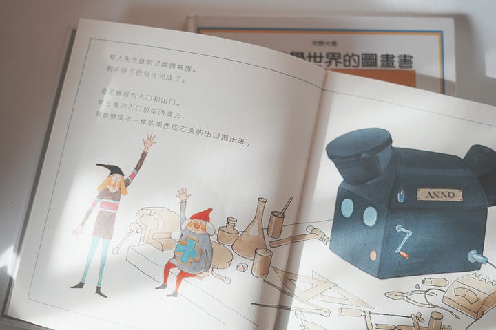 在安雅光雅的《進入數學世界的圖畫書 2》中,也有一台這樣的「ANNO牌魔術機器」,把任何東西從左邊的入口投入,就會變成不一樣的東西從右邊出口跑出來。